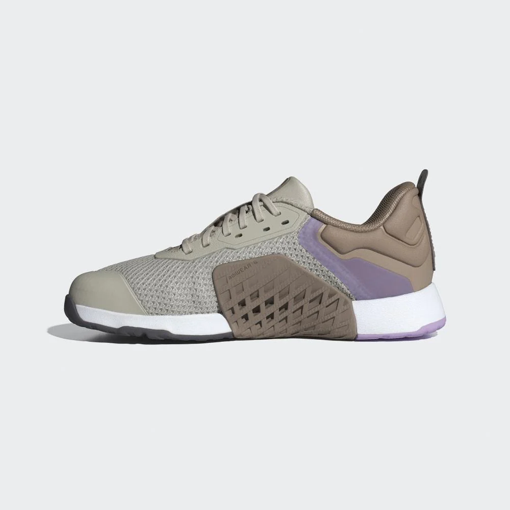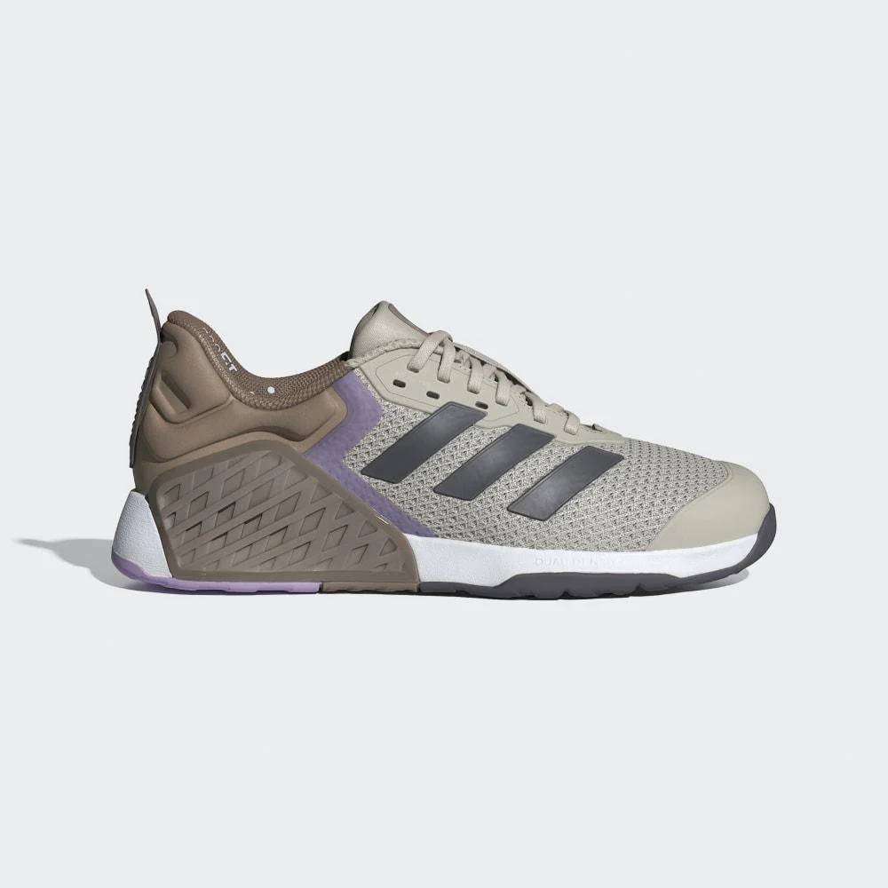 Color: combinación de tonos neutros y detalles lilas, con branding Adidas discreto y técnico.
