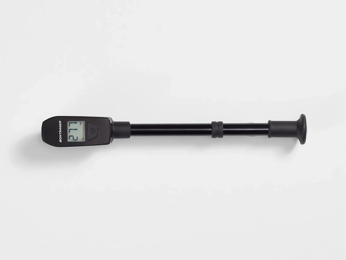 Bomba de amortiguador con manómetro fácil de leer y preciso, y diseño con rosca que minimiza las fugas para poder ajustar la presión de la suspensión fácilmente.