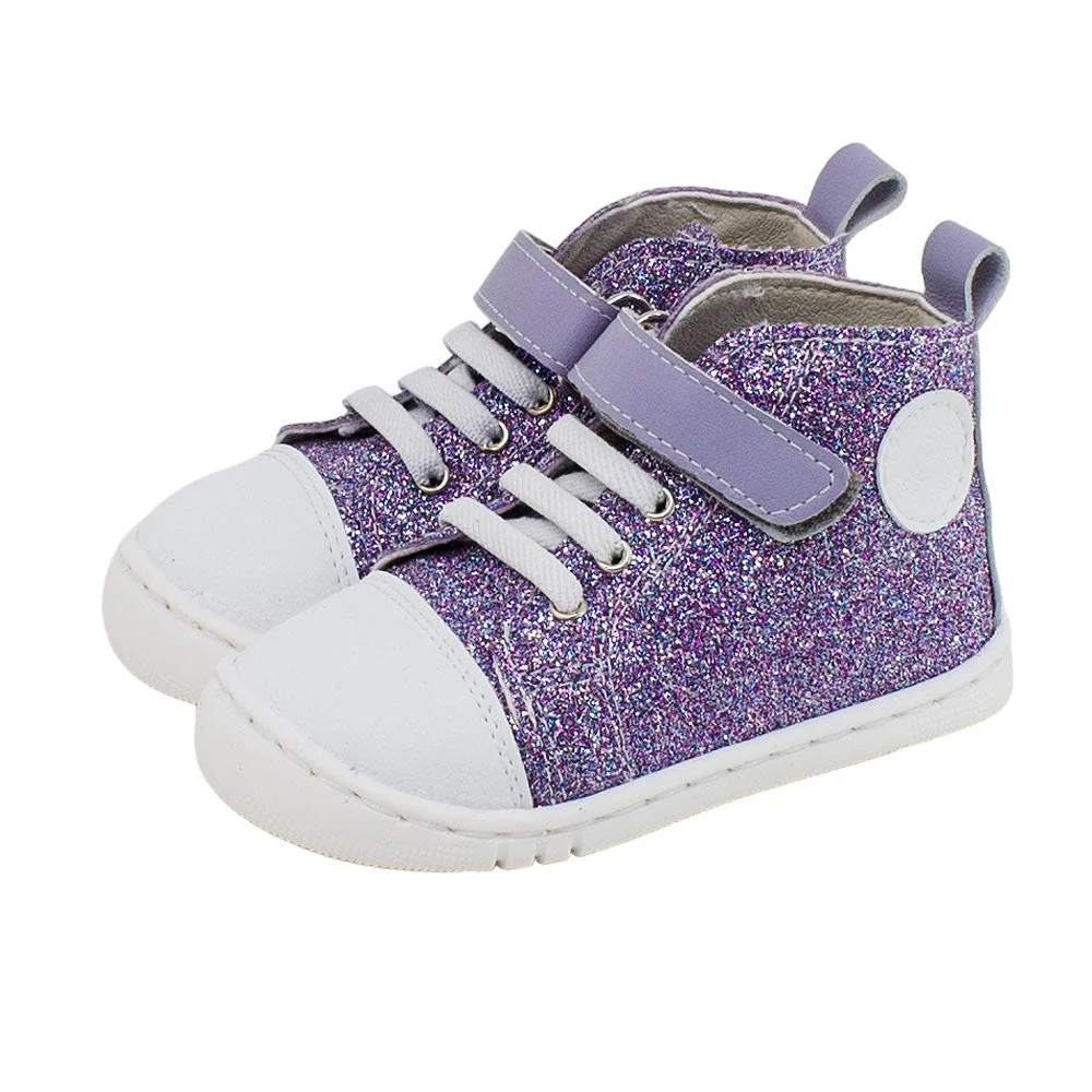 Zapato infantil marca Piruflex, tipo botín deportivo, con diseño en glitter morado brillante, punta reforzada blanca y cierre ajustable con velcro para mayor comodidad. Su suela de goma antideslizante ofrece seguridad al caminar, ideal para estilo y funcionalidad en el día a día de los pequeños.