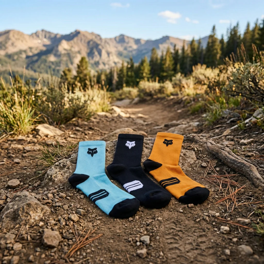 «description»: «Paquete de 3 pares de calcetines de mountain bike Fox Ranger en colores surtidos. Tejido transpirable con zonas de malla, compresión de arco y costuras planas. Disponibles en Azimut Adventure.»,