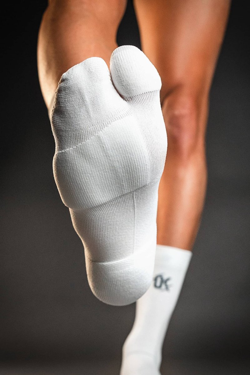 Calcetín biomecánico con las siguientes piezas: Almohadillado y separación del primer dedo, almohadillado de antepié, banda compresiva elástica compresiva en mediopié y almohadillado amortiguador de talón.