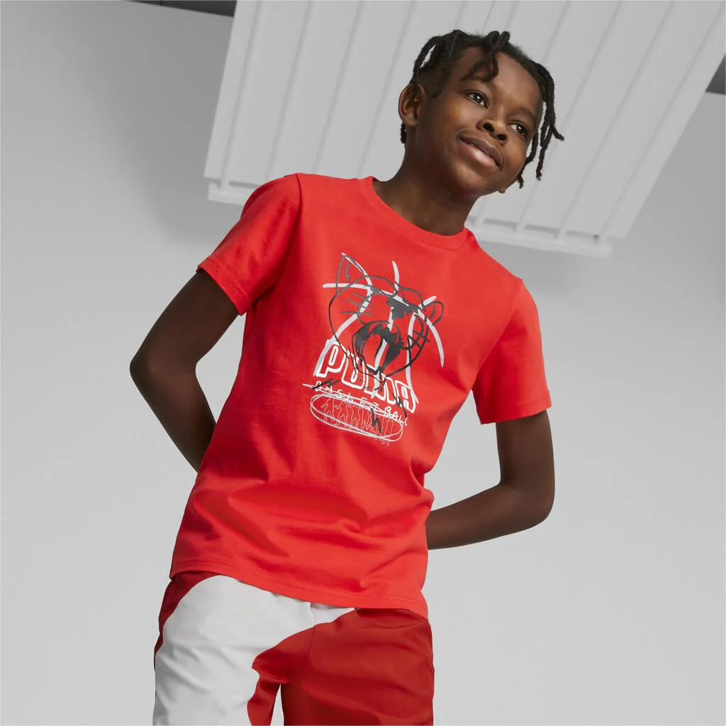 Haz como docenas de estrellas del baloncesto antes apareciendo en la cancha en PUMA. Esta camiseta celebra el mejor de los deportes, con un atrevido estampado inspirado en el baloncesto en la parte delantera.