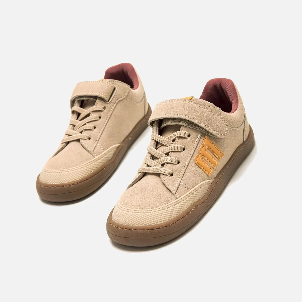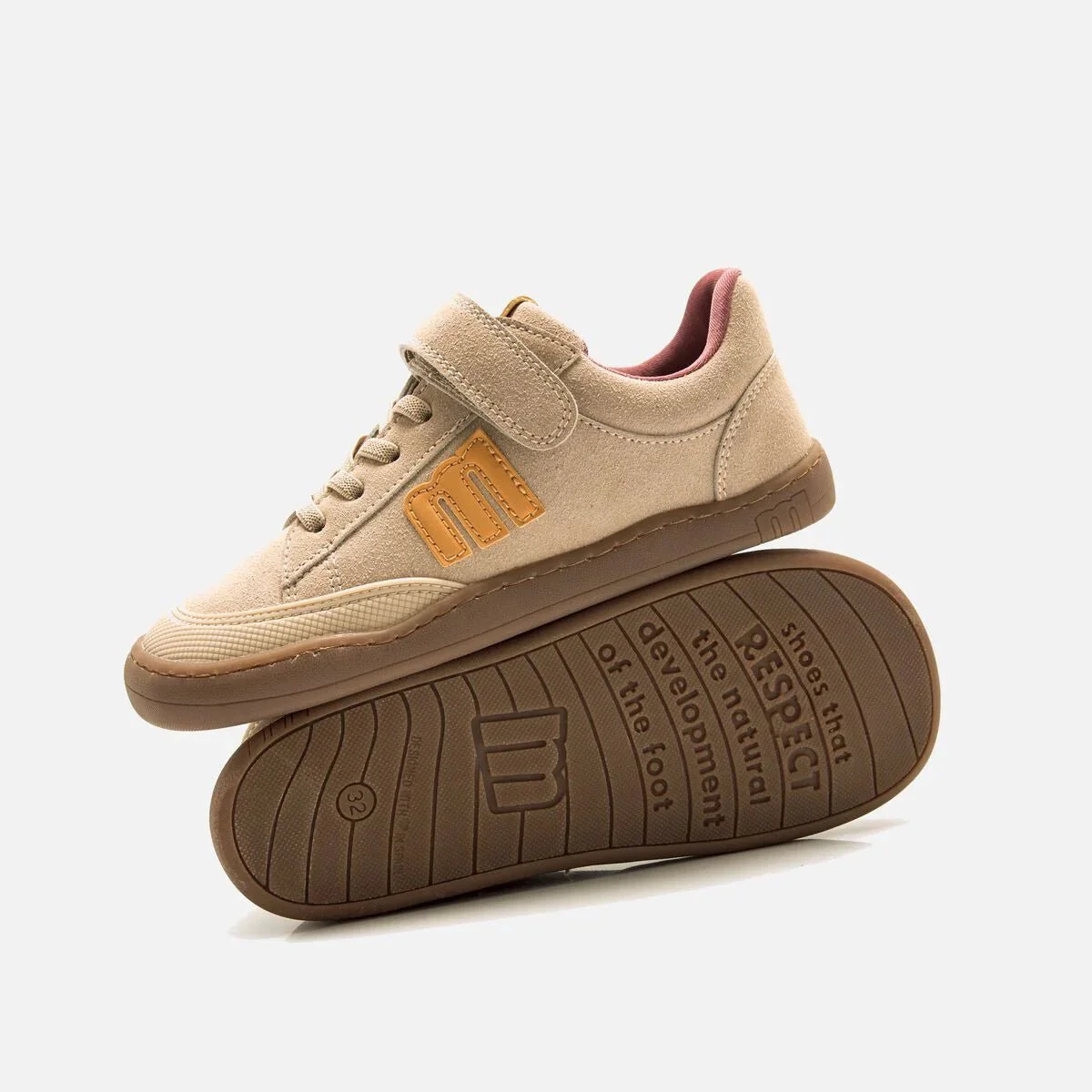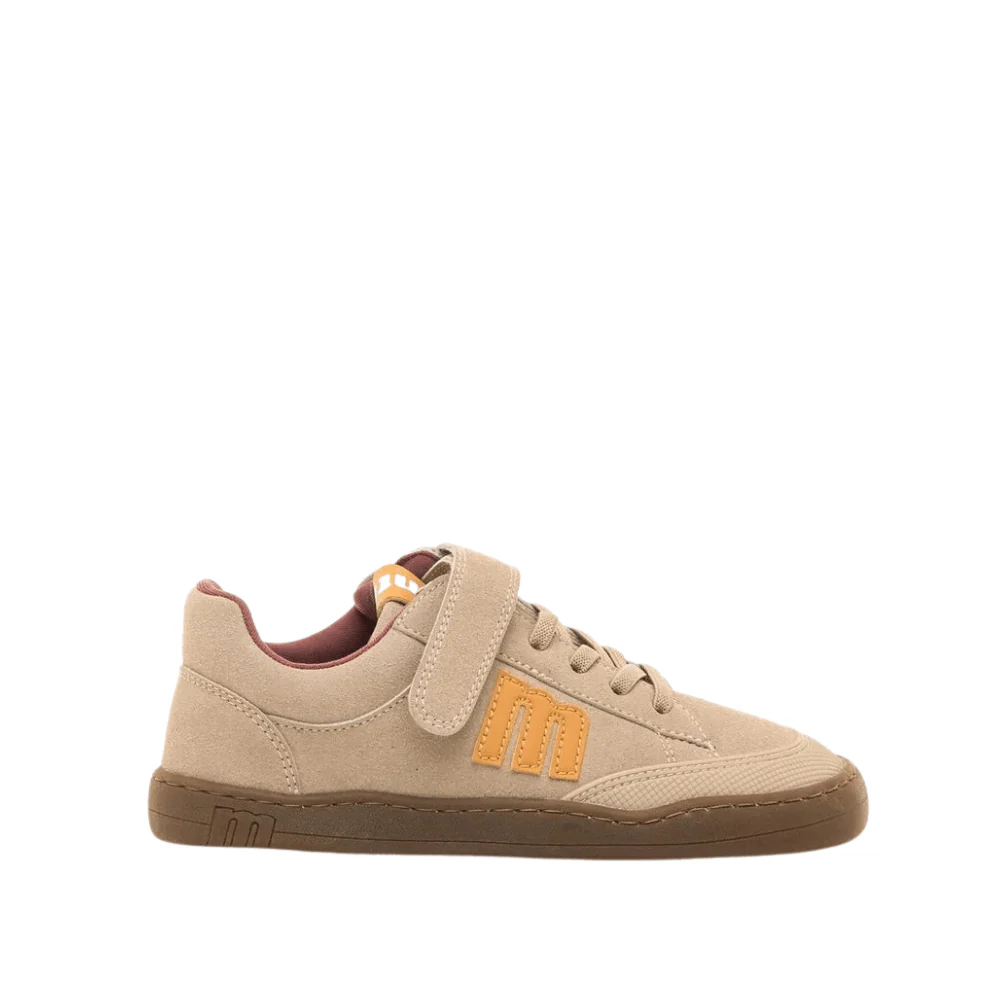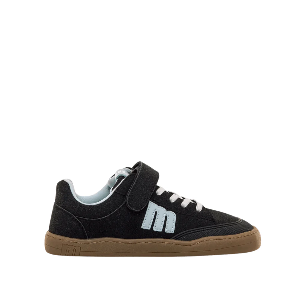 Zapatillas respetuosas Free de Mustang para niño con detalles en azul claro y suela caramelo. Minimalistas, con puntera ancha, cero drop y gran flexibilidad, respetan el desarrollo natural del pie. Incluyen plantilla de transición y cierre combinado de cordones elásticos y velcro. Certificadas como 100 % veganas por INESCOP.