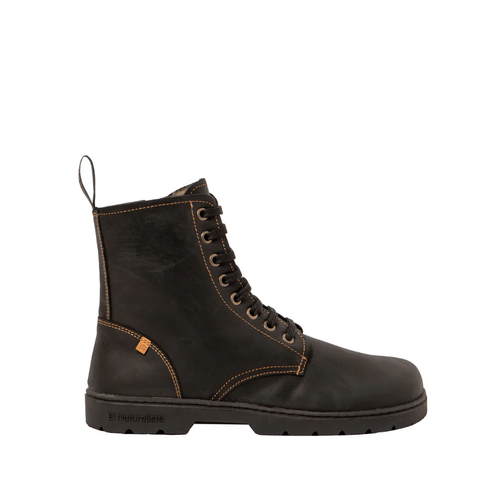 Botas barefoot de caña alta en piel negra de El Naturalista, diseñadas para combinar resistencia y libertad de movimiento. Con suela flexible, cordones clásicos y acabados robustos, ofrecen estilo atemporal, durabilidad y comodidad natural en cada paso.