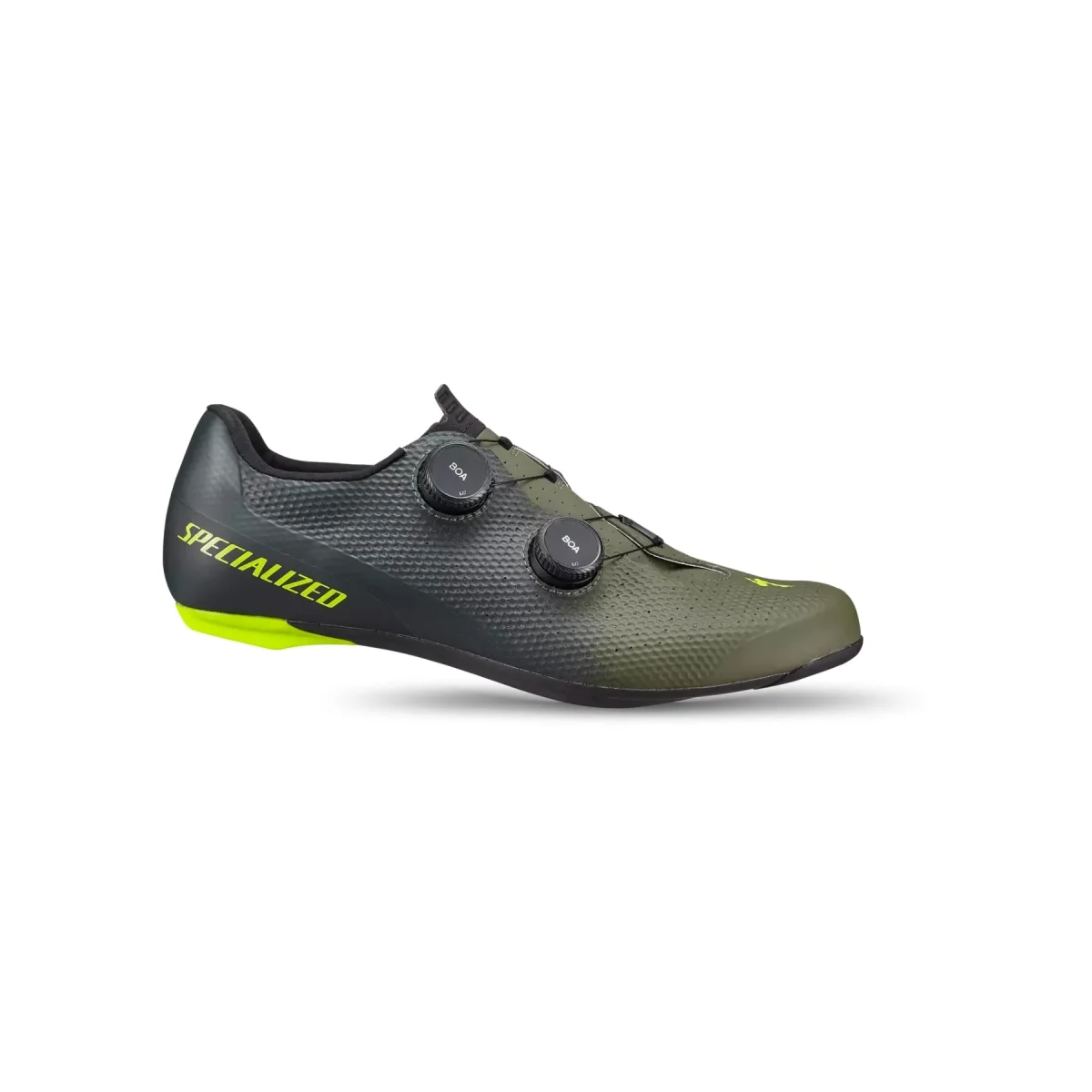 - Suela de carbono unidireccional diseñada para ser rígida, pero ligera, con un gran talón y puntera de goma para la tracción fuera de la bicicleta.
